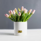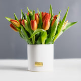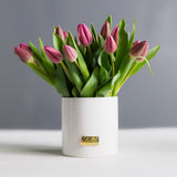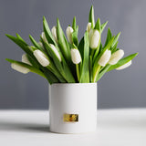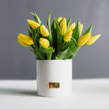Illuminez n'importe quel espace ou célébrez un moment spécial avec notre magnifique arrangement de tulipes fraîches, présenté dans notre élégant vase en céramique blanche signature.