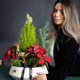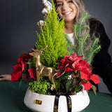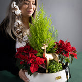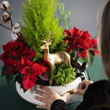 Notre Jardin du Réveillon Cette composition florale est une célébration intemporelle et élégante des fêtes de fin d'année. Elle réunit les éléments les plus appréciés de Noël : le rouge éclatant et velouté des poinsettias, le parfum frais d'un cyprès miniature et la douceur du coton d'hiver. Au cœur de ce jardin festif, un magnifique renne doré veille, ajoutant une touche de magie forestière.
