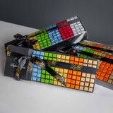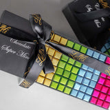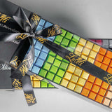 Ce coffret cadeau élégant et allongé présente un superbe dégradé de cubes de chocolat de qualité supérieureChaque carré est emballé individuellement dans une feuille métallique aux couleurs éclatantes. Des bleus et verts frais aux dorés, oranges et roses chauds, chaque carré est un petit trésor qui ne demande qu'à être découvert.