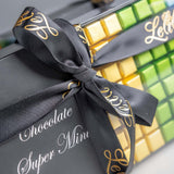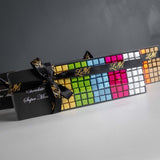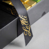 Les chocolats sont présentés dans un élégant plateau noir à couvercle coulissant transparent, mettant parfaitement en valeur leur assortiment arc-en-ciel. Orné de notre ruban de satin noir signature, estampillé du logo « Lelili » en doré, l’ensemble crée un contraste saisissant, à la fois ludique et raffiné.