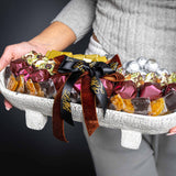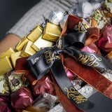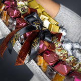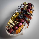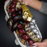Nous nous spécialisons dans arrangements et assiettes sur mesureEt le Voyager est un parfait exemple de notre savoir-faire. Les chocolats sont enveloppés dans de riches teintes de bordeaux, d'or et d'argent, parfaitement complétées par des dragées scintillantes enrobées de sucre argenté pour une touche d'éclat.