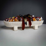 Présenté avec élégance dans un récipient unique en céramique blanche à pied et à la finition texturée, ce plateau en forme de bateau apporte une touche architecturale et moderne à toute pièce. Orné de nos rubans de satin Lelili emblématiques, noirs et rouille contrastés, il incarne le summum du raffinement.